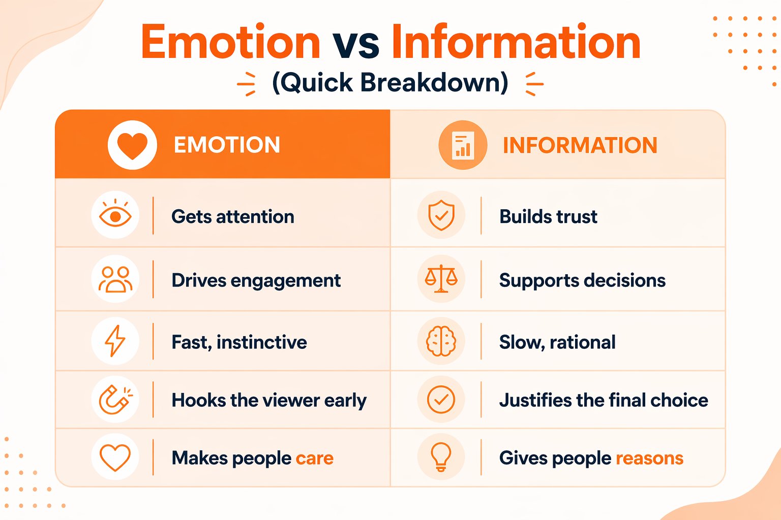 Information is what helps people justify a decision, especially in industries like SaaS, finance, or healthcare. In those cases, viewers still need logic, proof, and clarity before they commit (MarCom Today). In fact, multiple studies show the most effective approach isn’t choosing one over the other. It’s combining both: